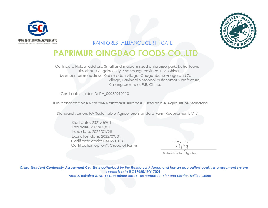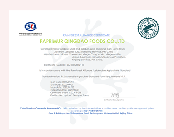 公司已經(jīng)通過BRC, KOSHAR, HALAL,RAINFOREST 認(rèn)證并按照BRC 標(biāo)準(zhǔn)嚴(yán)格執(zhí)行各項生產(chǎn)。我們始終堅持原料從源頭至成品的跟蹤化驗和追溯, 采用先進(jìn)的管理經(jīng)驗和生產(chǎn)工藝,為客戶提供高品質(zhì),可追溯,放心的產(chǎn)品。(證書)